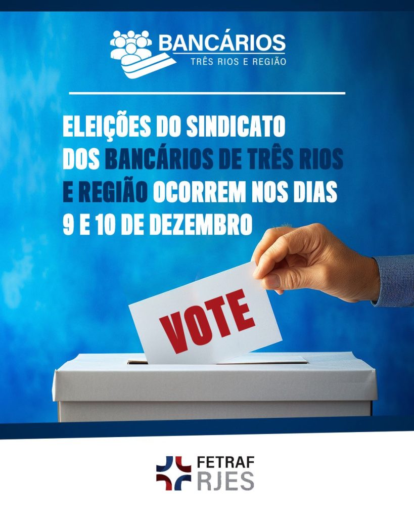 Nos dias 9 e 10 de dezembro de 2025, das 9 horas às 17 horas, ocorrem as eleições do Sindicato dos Bancários de Três Rios e Região, filiado à Federação dos Trabalhadores do Ramo Financeiro dos Estados do Rio de Janeiro e Espírito Santo (Fetraf RJ/ES).
