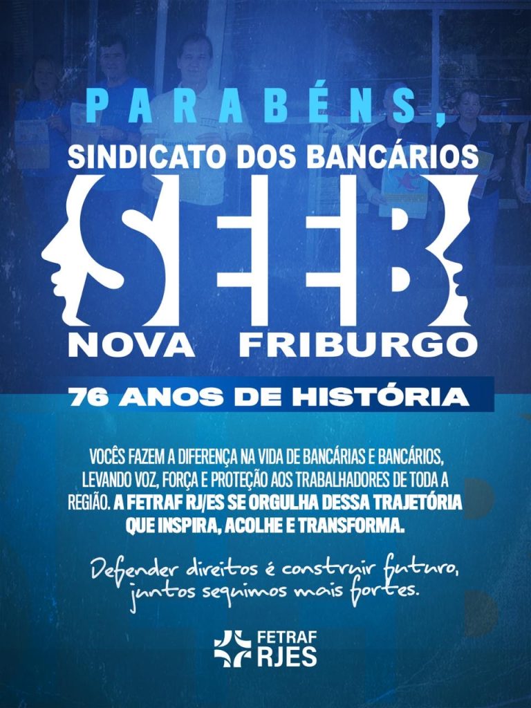 Neste sábado, 29 de Novembro, o Sindicato dos Bancários de Nova Friburgo e Região, filiado à Federação dos Trabalhadores do Ramo Financeiro dos Estados do Rio de Janeiro e Espírito Santo (Fetraf RJ/ES), completa 76 anos na defesa da categoria bancária.